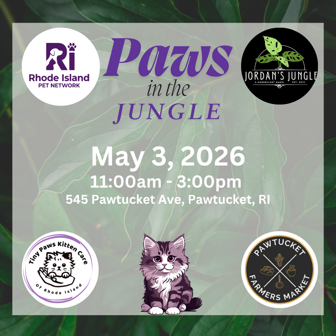 Meet us on Sunday, May 3rd at Jordan’s Jungle! We’ll be joined by Tiny Paws Kitten Care of Rhode Island with adoptable kittens, Four Dogs Senior Animal Rescue, Forever Home Reptile Sanctuary, and Shelter to Sofa, along witih multiple vendors from the Pawtucket Farmers Market. Come on down anytime between 11:00am - 3:00pm for a family-friendly free event - we’ll have animal-themed jewelry, cat figurines, handmade blankets, and dog harnesses of all sizes for sale. You can also learn more about how to support our mission!